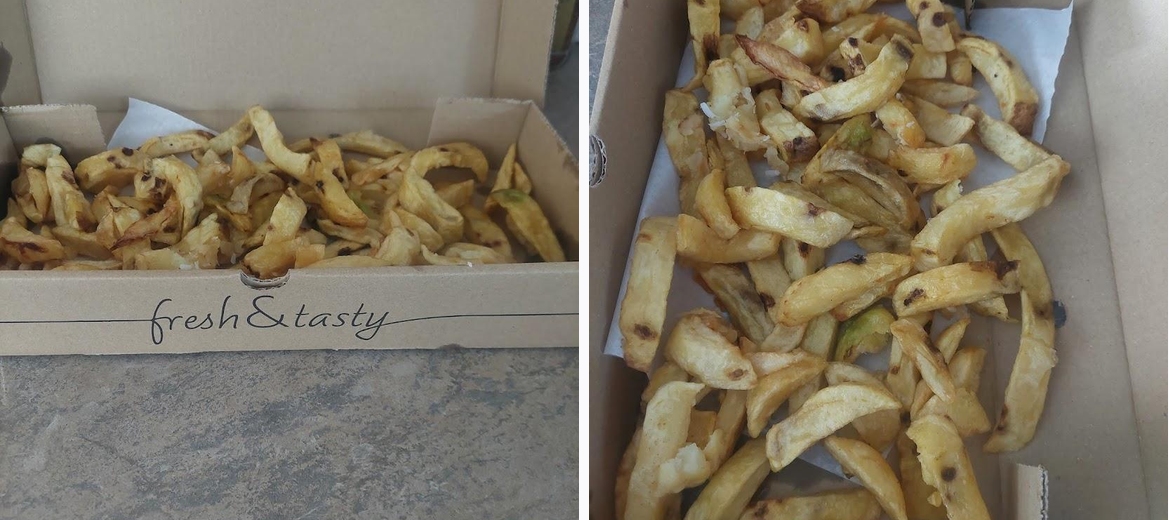 First time customer and will be returning. Portions are huge, a small chips could easily feed 2 adults, large cod was huge. Curry sauce is beautiful and all round lush chippie tea.