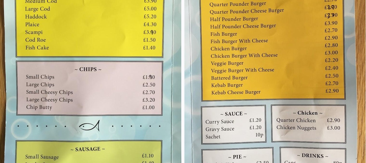 Food excellent, will definately be back beautiful piece of cod, loads of tasty chips, crisp batter, good service and friendly staff. Will definately be going for the oap portion next time, we had 2 small chips (they were not small), 2 med cod, large battered sausage and curry sauce, £22 something can't argue with that.